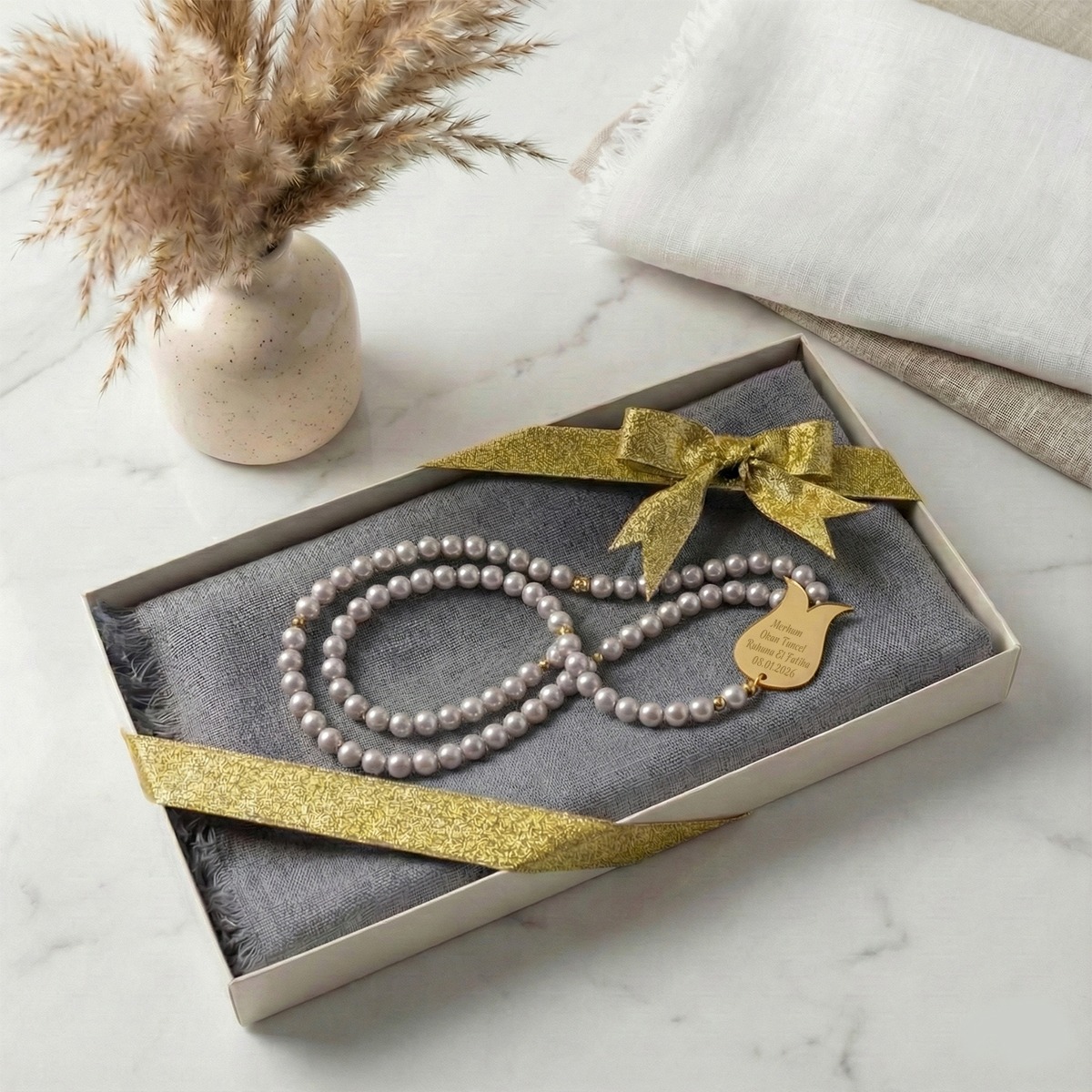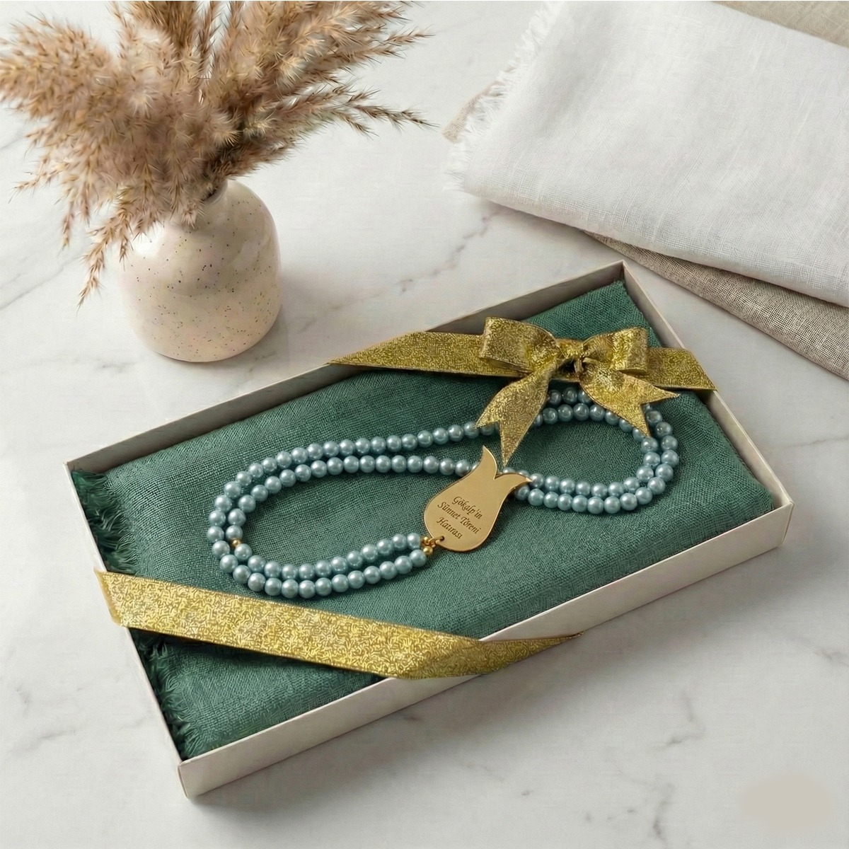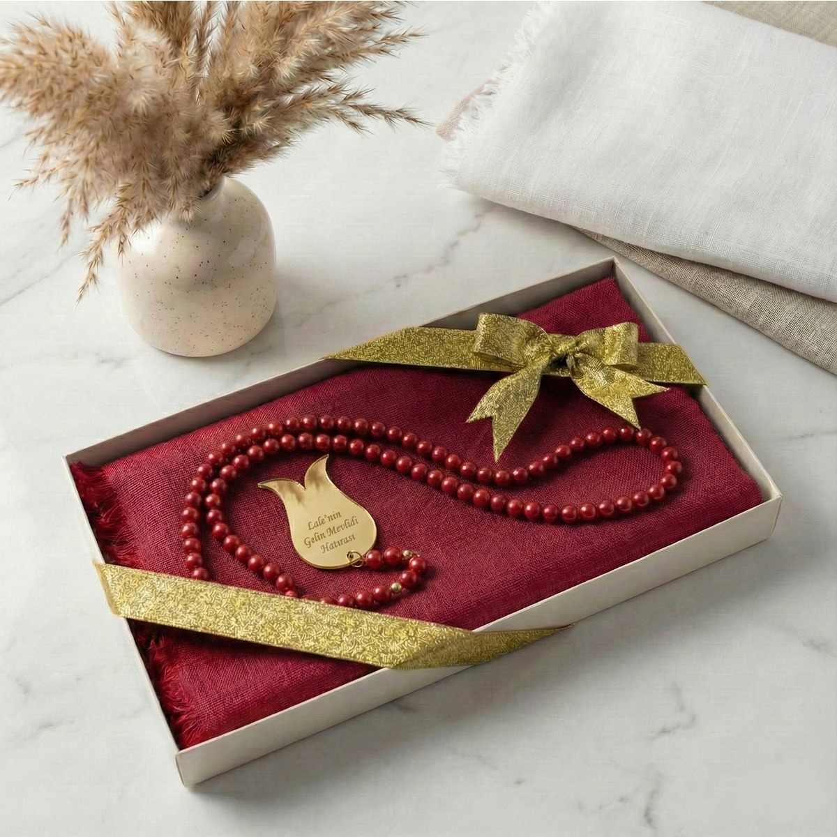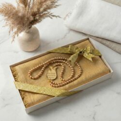 Lüks Kutulu İsme Özel İnci Tesbih ve Flamlı Pamuk Eşarp