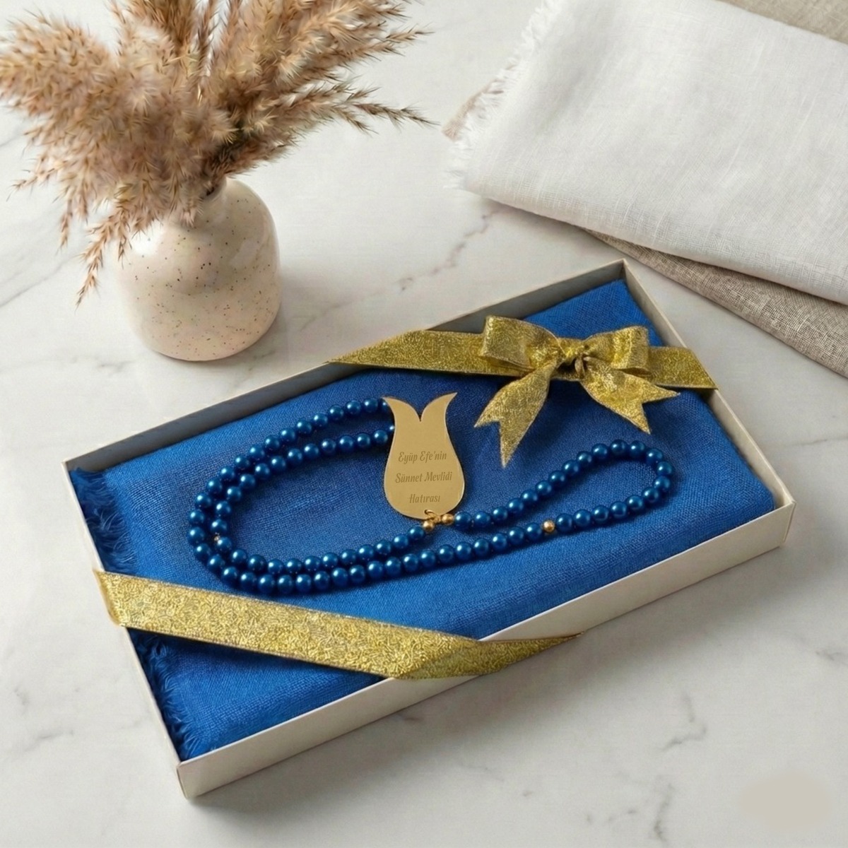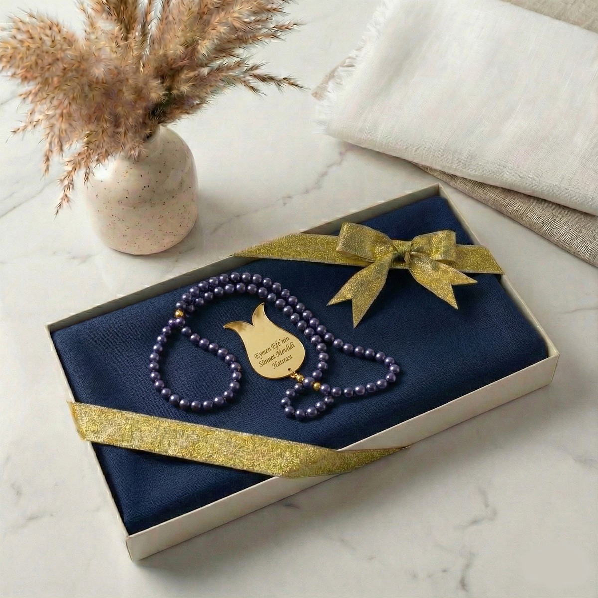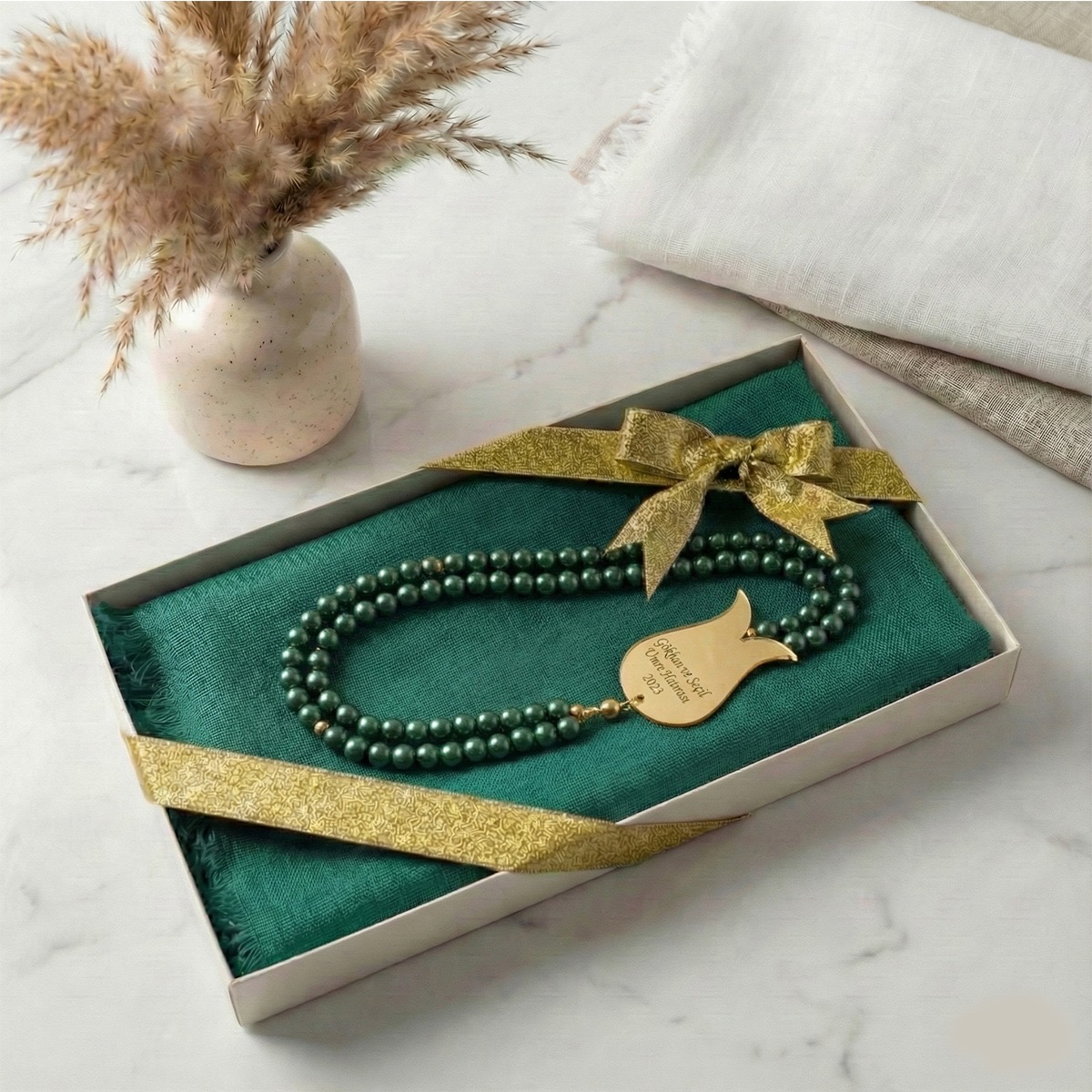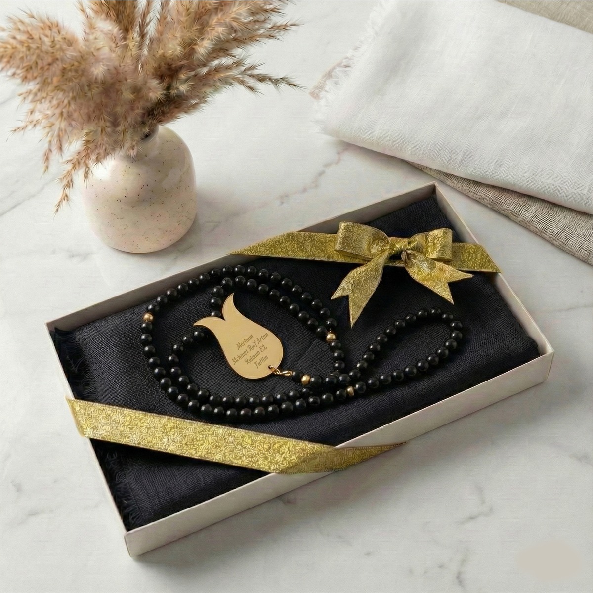 Lüks Kutulu İsme Özel İnci Tesbih ve Flamlı Pamuk Eşarp